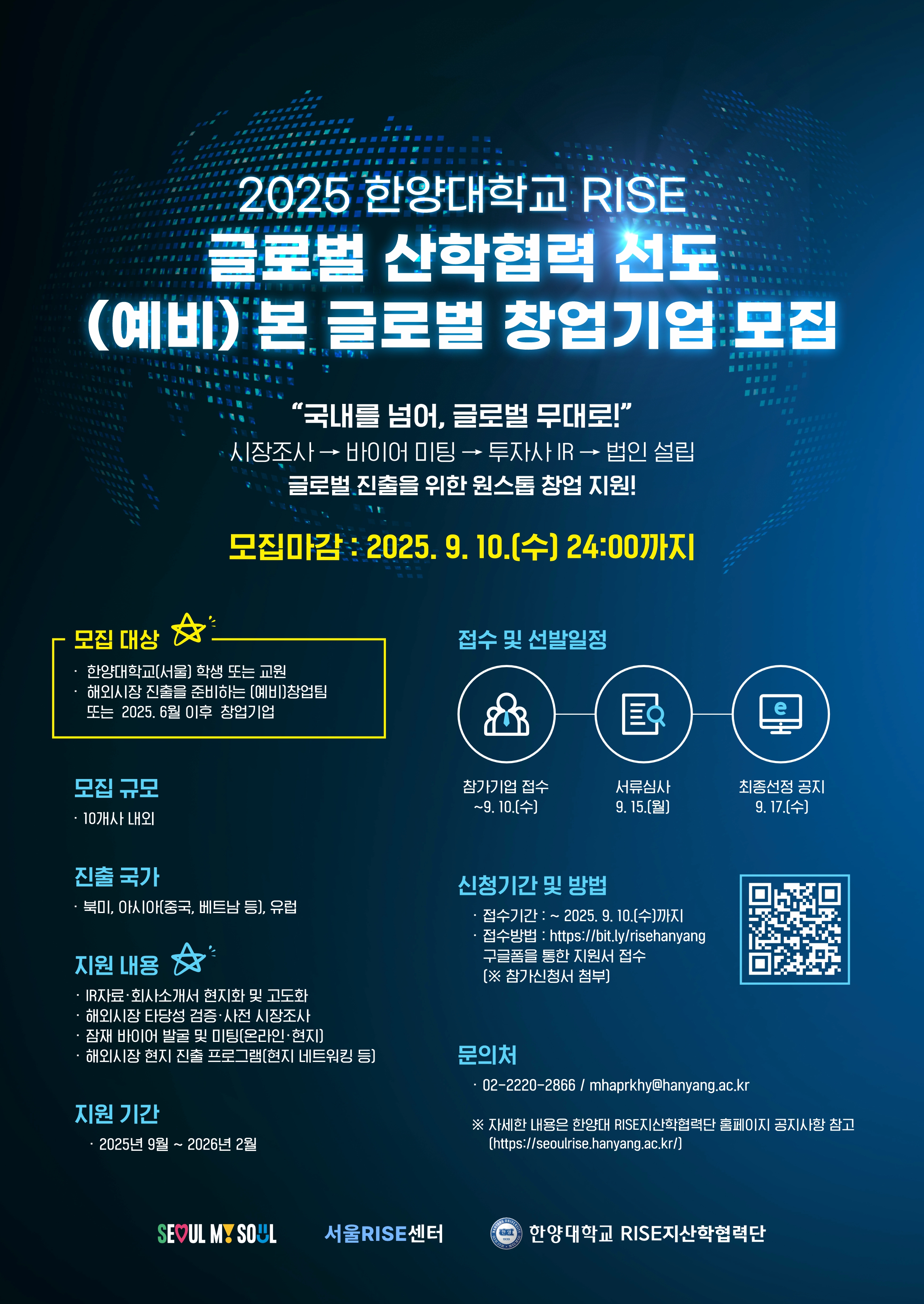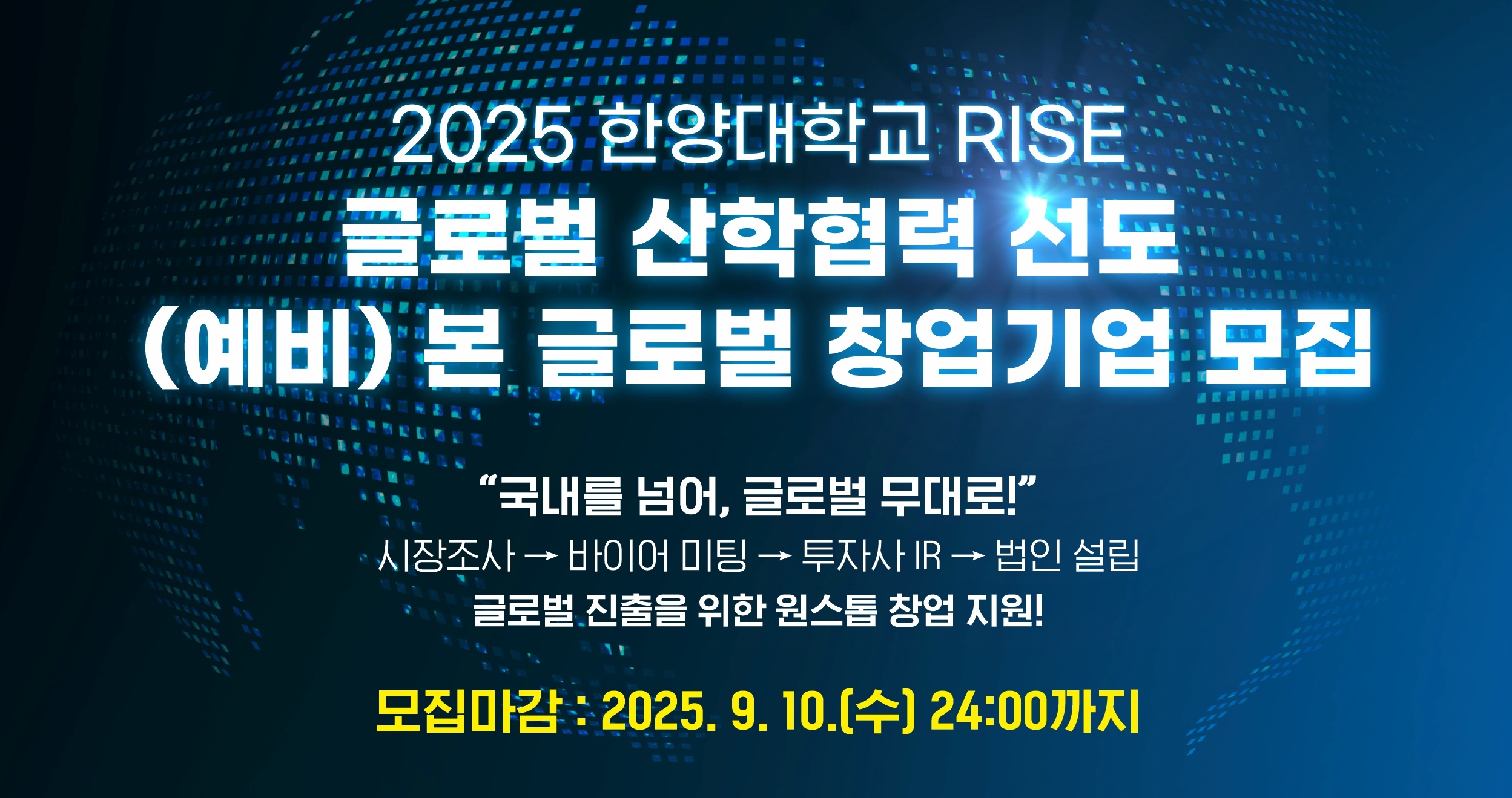 한양대학교 RISE 지산학협력단에서는 글로벌 창업 역량을 갖춘 유망 (예비) 본 글로벌 창업기업을 대상으로,